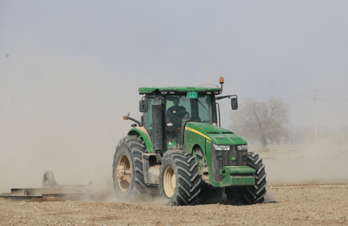 在新疆博乐市达勒特镇喇嘛敖博村的一片耕地里,博乐市江南种植专业合作社农机驾驶员陈晓斌驾驶着农机,正在进行土地平整作业。