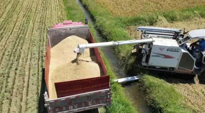 在码市镇锦陂村的稻田里,金黄色的稻浪随风起伏,数名经验丰富的技术人员驾驶着高效的大型水稻收割机在金色稻海中来回穿梭。行云流水地进行着收割、脱粒、秸秆粉碎还田等一系列操作。随后,一粒粒色泽金黄、饱满圆润的稻谷被准确无误地传送至等候在一旁的运粮车中,整个过程既迅速又精准。