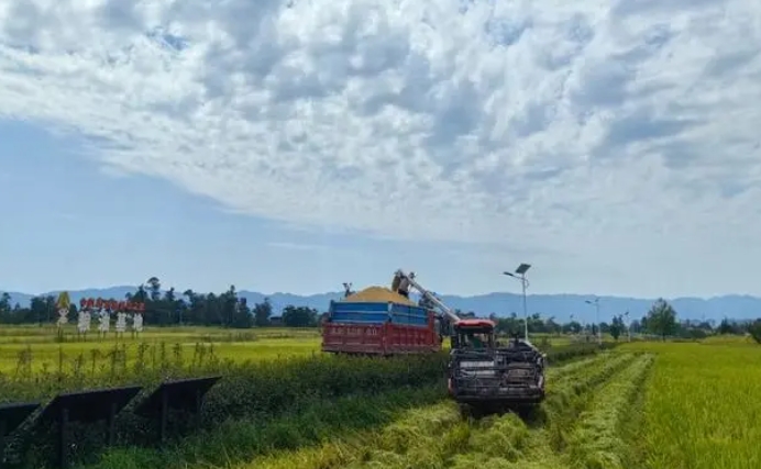 合作社农机手常正端驾驶着一台全喂入式收割机在稻田中来回作业。不多时,一把把稻穗被卷入收割机,收割、脱粒、碎秆还田一气呵成。不一会儿,一块稻田就收割完毕。连续几块稻田作业完成后,太阳已经升上山头,气温也逐渐上升。