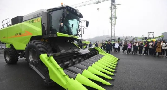 在中联重科农机展示坪,几十款行业领先的农机集中亮相,包含国内最大喂入量TF220谷物收割机、全球首台TE100-DH混合动力小麦机等行业首台套明星产品。