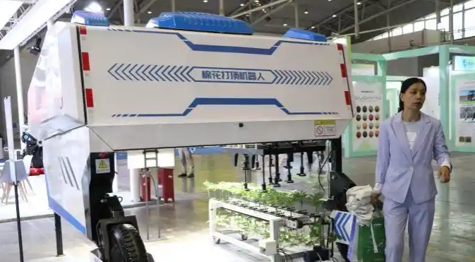 “我们研发的全球首款棉花智能打顶机器人采用‘双目视觉三维重建+AI规划算法’,可模拟大田棉花人工打顶动作,实现高精度、高效率作业。”新疆纬尔农业科技有限公司销售经理胡梁晨27日说。