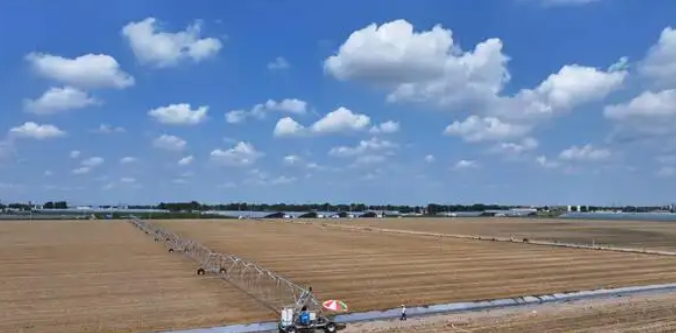 正值夏季高温的正午时分,在广饶县李鹊镇瀚翔家庭农场里,大型自走式桁架喷灌机正在为玉米和大豆进行灌溉。只见喷头喷出的水花似一顶顶圆伞均匀落下,瞬时让干旱的幼苗“解渴”,这让农场工作人员田家文很是欣慰,“这些‘大家伙’看起来很笨重,干起活来灵巧得很,打开手机轻轻一点,它们就会按照设定好的喷水量和速度进行灌溉,省水省电不说,你看我脚上不沾泥、身上不沾水就把地浇完了。”