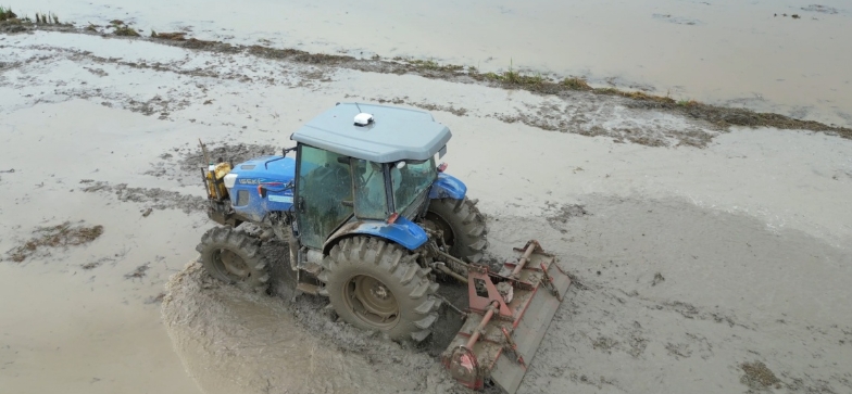 在平南县大新镇耕之田水稻智慧农场的稻田里,耙田机在泥泞的田里来回穿梭,不一会儿,一块块水田被翻动平整出来,等待插秧。据农场负责人梁胜钦介绍,该农场已实现全环节智能化作业,目前已经完成40多亩稻田的插秧工作。