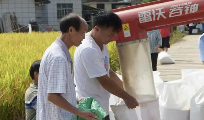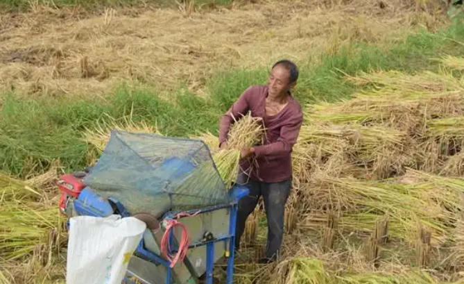 在机械无法覆盖的零散田块,村民们因地制宜采用“传统+现代”的混合收割模式。有的驾驶微型旋耕机开辟临时通道,有的手持电动脱粒机实现“移动作业”,还有的沿用传承百年的木制半桶打谷机——随着手臂有节奏地挥动,金黄的稻穗在木槽中翻滚,此起彼伏的“嘭嘭”声与远处收割机的轰鸣声交织成独特的丰收交响曲。
