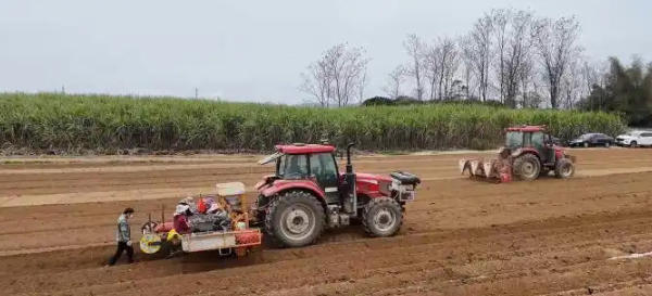 “以前人工种蔗,弯腰弓背一整天,一人最多能种半亩地,还经常出现行距不均、下种过深的问题。”来宾市金信农业有限公司负责人李金蔚沿着整齐的蔗垄边走边说,他流转的3000亩土地中,今年800亩翻种面积全程采用这套智能农机作业。蔗地里,种植机在北斗导航系统引导下沿直线匀速行进,机身后方的作业装置同步完成开沟、下种、施肥、覆土、盖膜、埋置滴灌带全套操作。