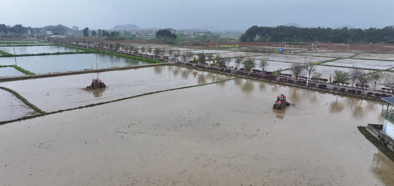 位于富川瑶族自治县古城镇高路村水稻种植基地,春雨淅沥、薄雾朦胧,三五白鹭翩跹落于田间,1300余亩水稻全面开启机械化种植,犁田机深耕松土、插秧机穿梭插秧、无人机精准施肥,各类农机协同作业,一幅生机盎然的春日农忙画卷徐徐铺展。