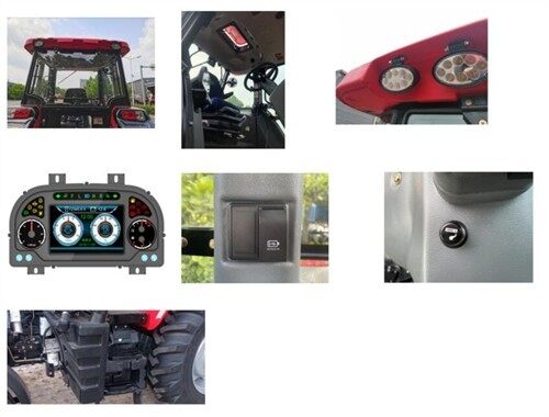 2.新一代滚塑顶驾驶室,隔热及密封性好、驾驶室噪音低、视野开阔、自带天窗驾驶更舒适;有选装防翻架配置,满足不同客户需求,经济实用。装配LED工作灯,亮度高、寿命长;智能七吋液晶彩屏组合仪表、显示内容多、可靠性高;具备人机交互功能,方便用户对整车进行维修;可实现保养提醒;集成后视影像功能,实时观察后置机具作业情况,更加方便实用。右侧四联翘板开关设计,USB充电器接口,2.1A大电流,满足手机等移动设备的应急充电;终端满足农机“三合一”补贴要求,具备“OTA”自动升级功能,补贴无忧。配备点烟器接口,可用作小功率电子设备的充电口;中央控制盒,集中控制,质量可靠,维修简单。燃油箱190L,油箱容积大,连续作业时间长。