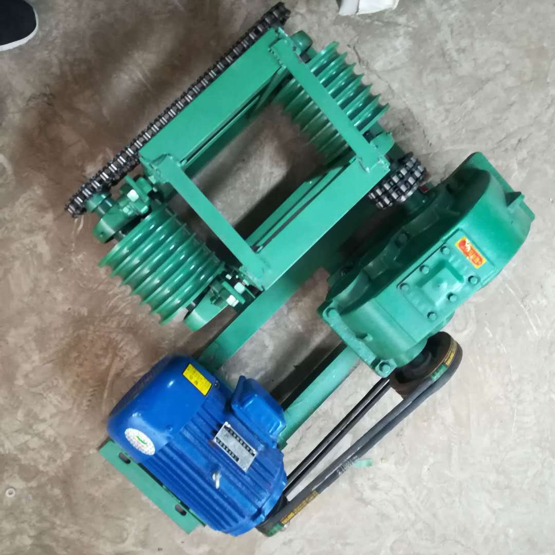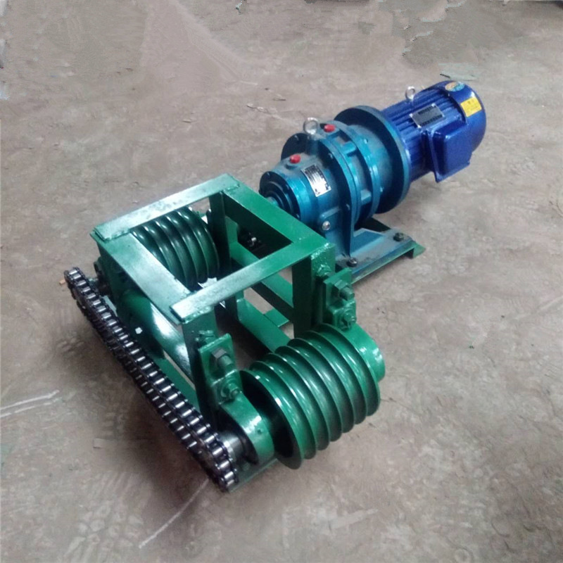 减速机输出轴通过链条或者三角皮带,将动力传到主驱动轮上,驱动轮和牵引绳张紧后的摩擦力做牵引,带动刮板往返运动,刮板工作时,由刮板上月牙滑块擦地自动落下,返回时抬起,完成清粪作业。