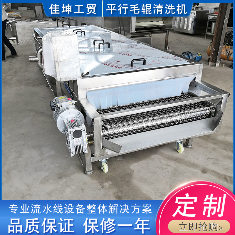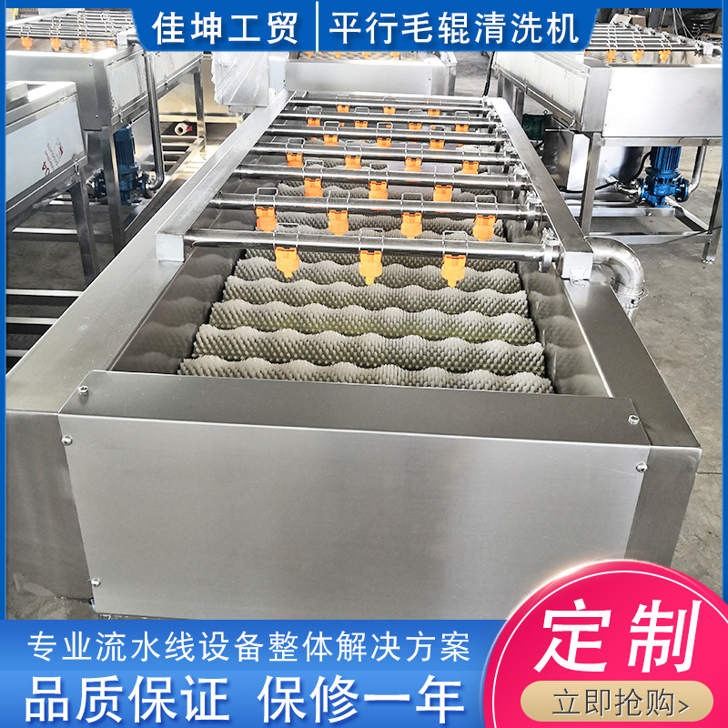 佳坤毛刷清洗机又称辊刷清洗机,适用于胡萝卜、土豆等各种根茎类蔬菜和柑桔类水果以及海鲜肉类物料的分拣清洗,(去皮去泥沙去毛等)采用食品级毛刷输送和清洗,利用旋转刷配高压喷淋,清洗效果好,能 清洗果蔬表面的污渍。去皮清洗机根据果蔬加工需求设计的用于圆形、长形果蔬的刷洗去皮等工作。适用于胡萝卜、白萝卜、土豆、红薯、苹果、桔子、元葱、山药、辣根、生姜等根茎类物料的清洗、去皮。具有清洗有效容积大、效率高,节水,可连续清洗,操作简单,使用寿命长等特点,刷辊材料经特殊工艺处理,经久耐用,耐磨性能好。