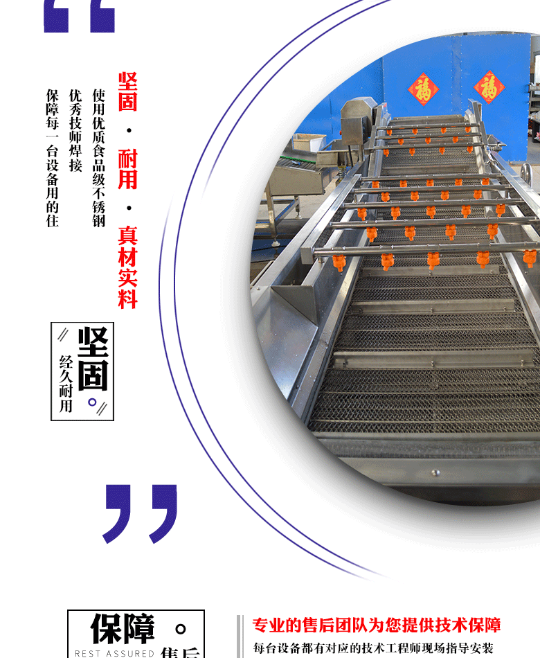 我公司设计的气泡清洗机采用气泡水浴清洗,辅以强水流催流,清洗能力大、洗净率高且不损伤物料,经过旋翻催流至输送网带,在网带上进行高压水喷淋清洗。本设备除电机等标准件外均采用不锈钢SUS304材料制作,完全符合出口食品卫生要求。设备中设有气泡发生装置,使物料呈翻滚状态,去除产品表面污渍功效,(可配蒸汽加热装置将水加热到合适温度,进行热水冲刷清洗),漂浮物可以从溢流槽溢出,沉淀物从排污口排出,以达到清洗的目的。