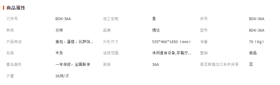 “博达机械”生产的面团分块机设计先进,全机身采用进口不锈钢材料制造,外观美观大方,性能良好,使用方便,所分的面团(馅料)重量准确,操作时间短,可节约大量的劳动。该机通过工作台上下循环推动料盘,使物料与分块机刀盘接触分离的原理而实现等量分块。该产品可分割面团和月饼等馅料,每次等份36份,噪音低,效率高,分割均匀,每件重量可由30克至140克。本产品广泛适用于宾馆、酒楼、饭堂、食品加工厂、面包店等单位场所。