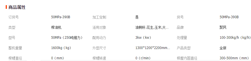 特点:容量大、压力高、出油多、压榨时间短、操作简单。占地面积小、耗电量低、磨损小、框架架构坚固、使用年限长;压榨出的油香味浓、口感好、干净清澈、杂质少,营养成分全。麸饼中的蛋白等成分保留多。