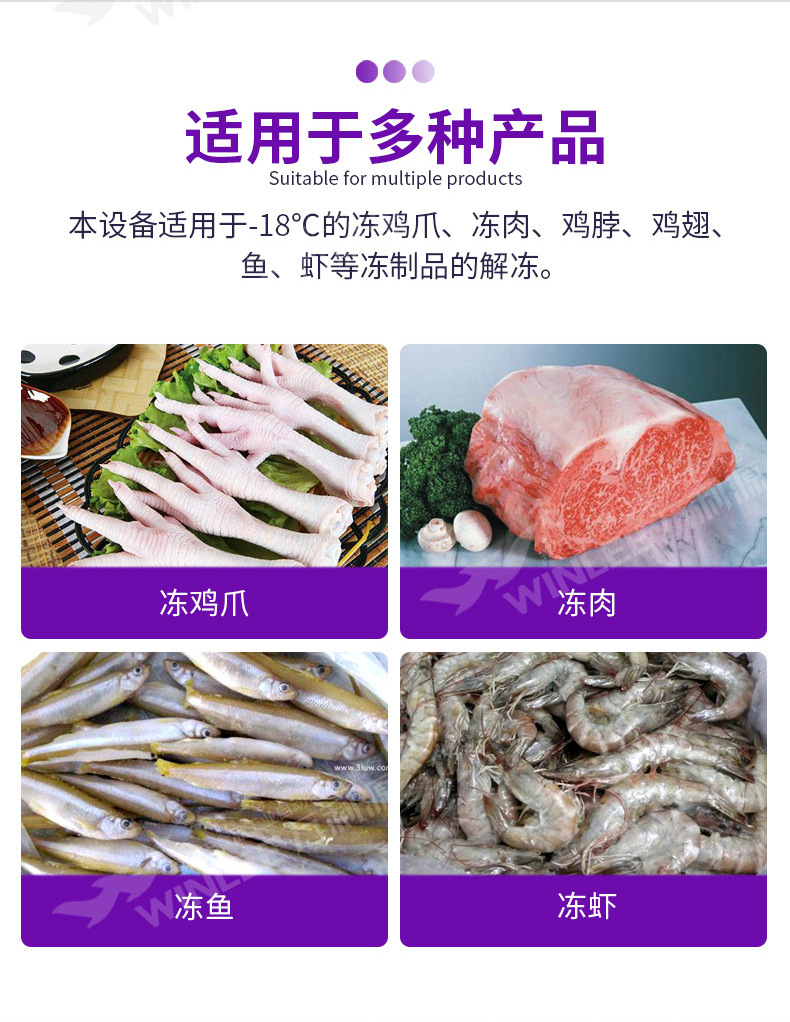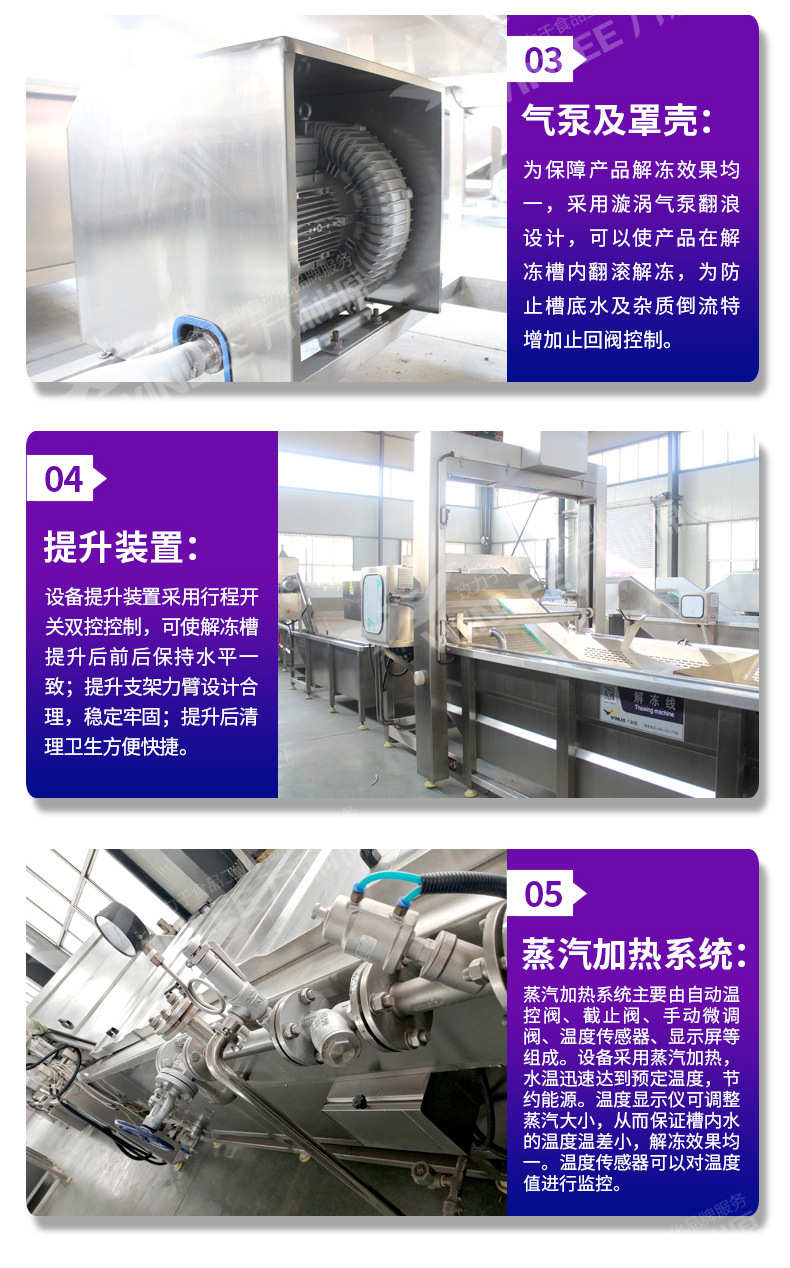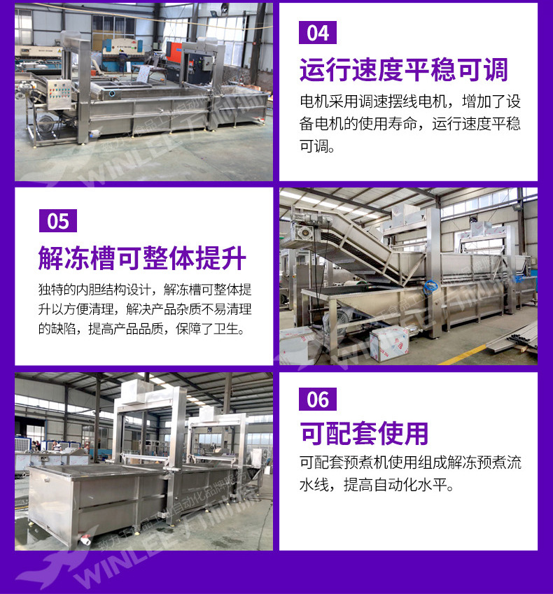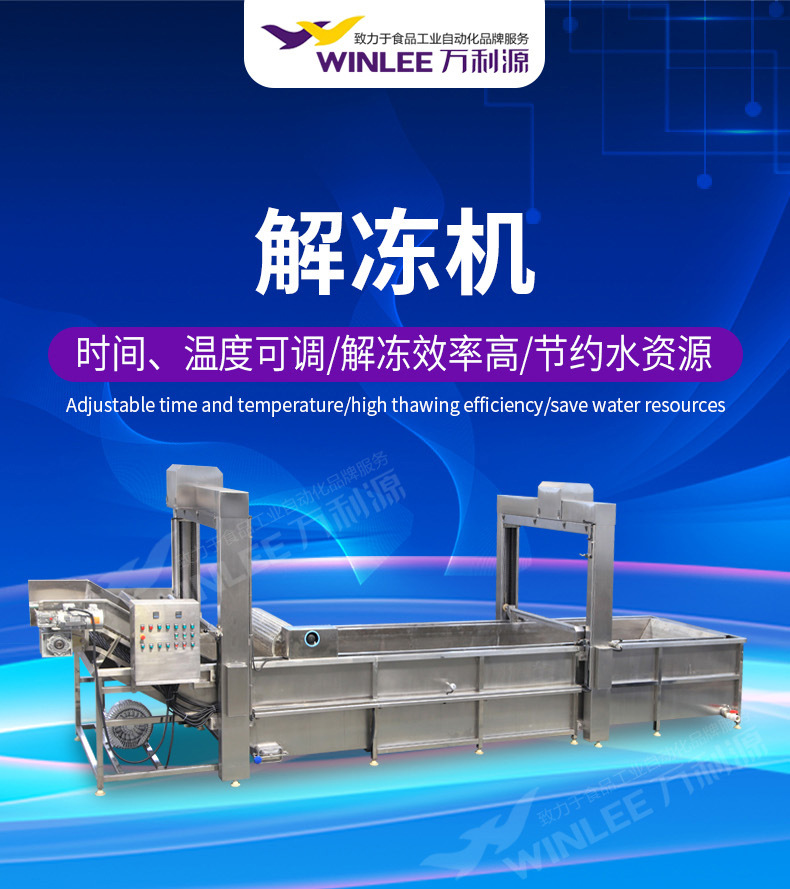 解冻机是我公司新推出的一款解冻设备,主要适用于鸡产品、鸭产品、肉产品、海产品等的解冻,化冻、沥血;解冻机其特点构造简单大方,实用性强,时间,温度可调控的特点、工作效率高,节省人工成本,独特的内胆构造,解决遗留产品、杂质难以清理的缺点,在保证产品品质的同时,保障了卫生标准。解冻机也可以用于魔芋的清洗自动酸碱中和,解冻处理。将魔芋放进加满水的解冻池,用高压气泡将水快速翻腾,让产品在解冻池内相互碰撞,相互摩擦,从而达到快速解冻的目的。解冻池旁边有恒温池,循环利用,起到对水资源的节约,又能环保。既能降低成本,又能提高工作效率。解冻池旁边设有自动酸碱中和副槽,解冻池设有搅拌装置。