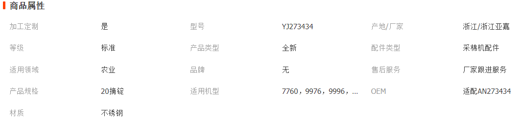 浙江亚嘉采棉机配件有限公司是一家专业生产采棉机配件的企业。产品包括采棉机摘锭、摘锭总成(年产300万套),座管、座管总成,脱棉盘、脱棉盘总成,水刷、水刷总成,以及适配约翰迪尔和凯斯采棉机采棉头的大多数零配件。产品主要销往中国,美国,巴西,澳大利亚,土耳其,希腊,以色列及中亚等。