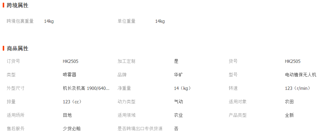 植保无人机产品参数: