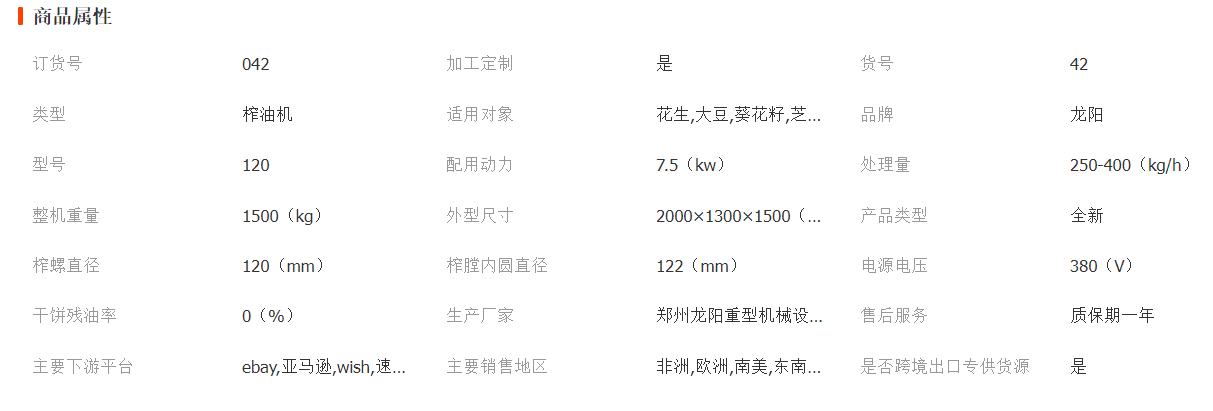 榨油机该产品是我公司应时常发展和需要,完全自主研发的一代新品,该机保持了传统油机的优点,克服了存在的不足,增加了自动加热升温装置,熟榨一遍榨尽,出油效率有所提高,同时也可以为浸出油厂作预榨配套。这种产量大、性能稳定的油机,属国内首创,是中、大性油厂的理想产品。受到客户好评和急需,适用与各种食用植物原料
