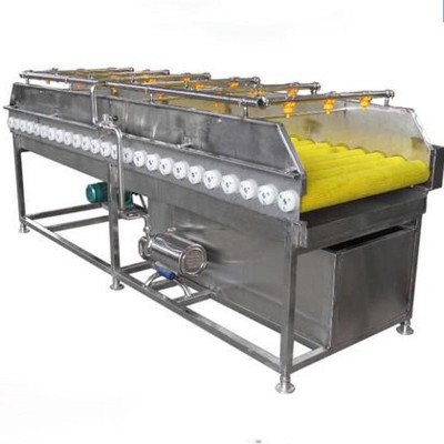 毛辊在电机的带动下通过相对逆向滚动,与产品直接接触产生摩擦达到清洗效果;并设有特制的自动高压喷淋喷头进行冲洗,即可达到产品清洗的效果;毛辊清洗机可根据产品需要加装不同的毛刷辊,山药清洗适宜选用丝质较软的毛刷辊,以免对山药表皮造成擦伤,软毛刷清洗可达到对果蔬上腊抛光的作用。并要注意的是,工作时要先开机运行后再投料,这样可以延长电机寿命,减少电机损坏的机率。