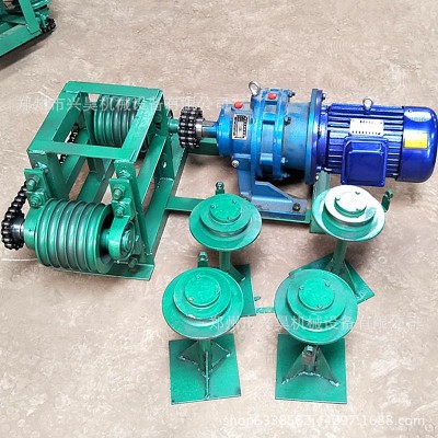 2.紧绳:2人配合,先把绳头固定到转角轮轴上,把绳绕过其余转角轮再绕好绳滚,1人控制开关,另1人拉着绳头,用主机把绳子拉紧,找好绳子长度,将多余绳子截断,然后把绳头连到另外1个绳头上,可用8号镀锌丝扎紧,然后将转角轮轴上固定的绳头松开,将刮板按位置摆好,将绳子和刮板铁架固定牢固即可。