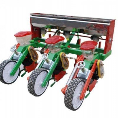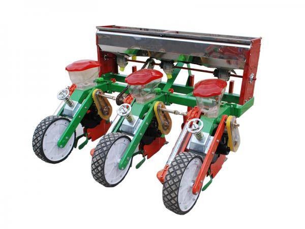 采用优质管材焊接,重量轻,结构合理,强度大,使用性好;部件与机架的链接均采用U型螺丝,压板链接,及组装快捷,调整位置方便,又紧固可靠;采用单体驱动播种机构,每个播种总成均能独立完成整个工作过程;合理化的双减震设计,既美观牢固,又有效避免了因底轮打滑造成的漏播现象;流线型扁铲式开沟器,降低了动力消耗,活式合金钢头,调整方便,同时又经久耐用;采用换挡式的株距调整结构,使得株距调节方便一致合理;采用仓转舀勺联体式单粒播种器,采用铝合金精致而成,抛除了传统播种工艺中的毛刷与塑料轮,无易损件,大大延长了使用寿命,排种效果可与气吸式精良播种机相媲美,不仅节省籽种,还真正实现了播种行业的一次创新革命。