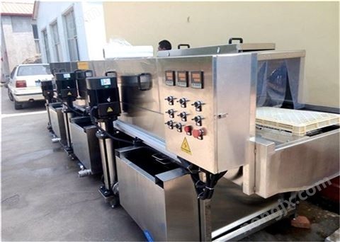 详细信息:1.清洗机以高压喷淋冲洗为主要清洗方式,以约60℃热碱水为主要洗涤剂,以约60℃高压热水为主要清洗力进行清洗,在热碱水喷淋后加设毛刷对筐子左右及底部进行刷洗,提高清洗洁净度;2.设备有热碱水喷淋段、毛刷刷洗段、热水喷淋段、清水喷淋段、消毒水喷淋段、烘干段等几部分组成,其中毛刷刷洗段、消毒水喷淋段及烘干段可根据客户要求定配