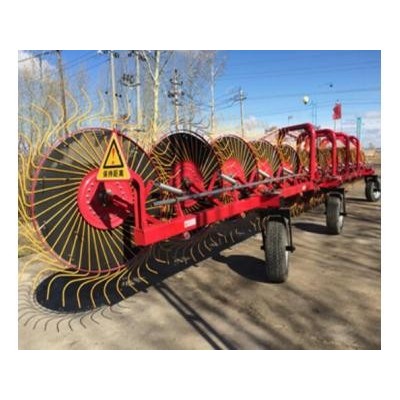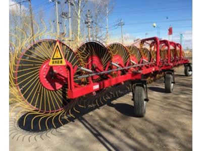 该机具与35马力以上的拖拉机配套使用,适合于地势平坦的地况上作业,对割倒晾晒后的牧草、苜蓿、小麦、大麦等作物秸秆进行搂集或翻晒作业。该机具主要由牵引梁总成、指盘总成、前后行走轮总成、主梁、液压系统、U型梁、滑杆总成等部件组成,其结构合理、性能稳定,工作幅宽,有效提高 工作效率,搂集的草条宽度均匀,有利于捆草机捡拾作业,搂草损失率低,可以将草条翻转过来或将多个草条合并成一个草条。
