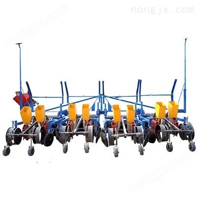 精量铺膜玉米播种机自主研发生产的“2MB-3/6型气吸精量花生铺膜播种机”(以下简称播种机)是一种技术成熟、性能可靠的专门用于花生种植的一体化作业机械。 精量铺膜玉米播种机1、设计新颖,结构合理,操作简单。 该机性能优良、结构合理、功能齐全、调整使用方便,能一次性完成撒肥、起垄、垄顶施肥、垄面镇压成形、开沟、打药、覆膜、气吸式鸭嘴播种、穴孔覆土和镇压等多项作业,是人工播种效率的80~120倍,大大减轻了农民的体力劳动强度,提高了生产效率,促进了我国农业机械化的发展,市场前景广阔。以价格低廉,工作效率高等优点,成功推向市场,已成为广大农民朋友的好帮手,深受广大用户的亲睐。 工作原理: 此播种机悬挂于四轮拖拉机的后方,工作时,先由电动机带动施肥机构工作,先把一部分肥料经簸箕形滑板直接均匀的撒到地里,然后,安装在机架两侧的起垄犁开出垄的毛坯,接着由开沟犁在垄上开沟,施肥器将另一部分肥料撒入沟中,随后由仿形轮镇压过毛坯,将毛坯面压出下宽上窄的梯形垄,喷药机构将农药喷洒到垄面上,然后在垄面上覆盖薄膜,并在膜的两侧进行覆土压实。后由鸭嘴式排种器进行膜上播种,覆土机构将播完种的孔穴进行覆土掩盖,随后由镇压机构压实,完成整个播种过程。
