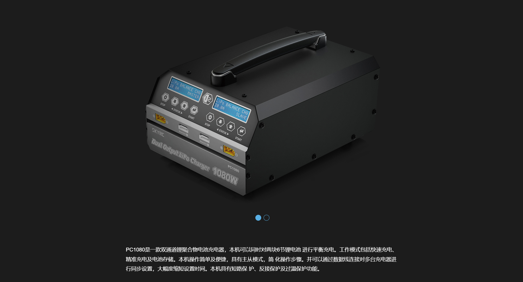 PC1080是一款双通道锂聚合物电池充电器,可以同时对两块6节锂聚合物电池/高压锂电池 进行平衡充电。工作模式包括快速充电、精准充电及存储模式。本机操作简单,具有主从模式。并可以通过数据线连接对多台充电器进行同步设置,大幅度缩短设置时间。本机具有短路保 护、反接保护及过温保护功能。