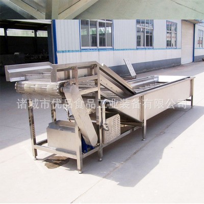 物料进入水槽,在高压水流和强力气泡的作用下,被充分打散、翻滚、清洗、传送。从物料表面洗掉的泥沙沉入底部的隔离舱,不会发生翻扬回流造成再度污染,在沉淀杂质的处理上,通过循环水泵的水循环,让杂质进入过滤箱,水箱的过滤装置可以自由的拆卸,二次过滤让杂质遗留在水箱处,漂浮物通过上端的溢水口排除,漂流不出的通过弧形过滤网拦截,保证水池干净的同时,能够及时的排出杂质,保证产品清洗效果。产品通过网带输送出口处,配备有二次清水清洗,在保证产品清洁度的同时,更能及时给设备槽体内补充水源,保证设备内的水源清洁度,达到清洗效果。本设备用于新鲜番茄、菠菜、白菜苹果、葡萄、榨菜、洋葱、辣椒以及其他根块状果品蔬菜的漂洗。