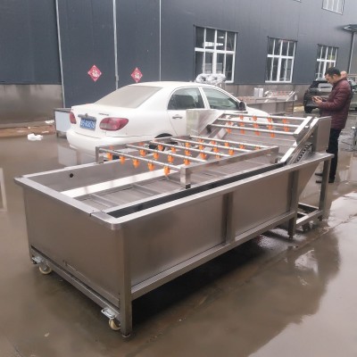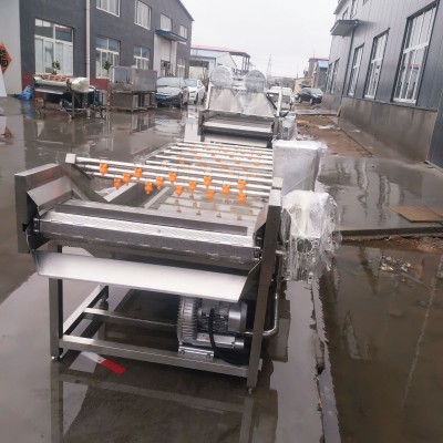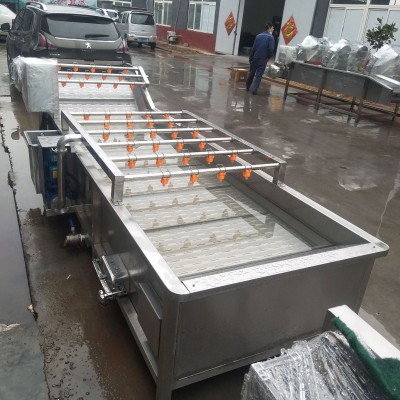 2、该机利用旋涡风泵通过送汽管槽底送气排管上的小孔,向水槽水中送气,通过高压水的射流作用产生大量气泡及涡流对果蔬进行翻动冲洗,被分离过的泥沙通过隔渣孔板沉入槽底,毛发纤维虫卵漂浮在水面,被水流推入两角的隔离板内,以此循环将果蔬洗净,如两台并用,进行粗洗。清洗线,清洗线