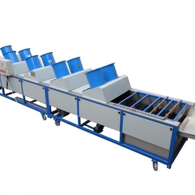本机器是由提升机,清洗机,风干机组成。提升机是自动提升的,它通过滚杠自动旋转来达到均匀上料;清洗分级机是由20条毛刷和一组强风风机组成;风干机有20条毛刷和两组强风风机组成