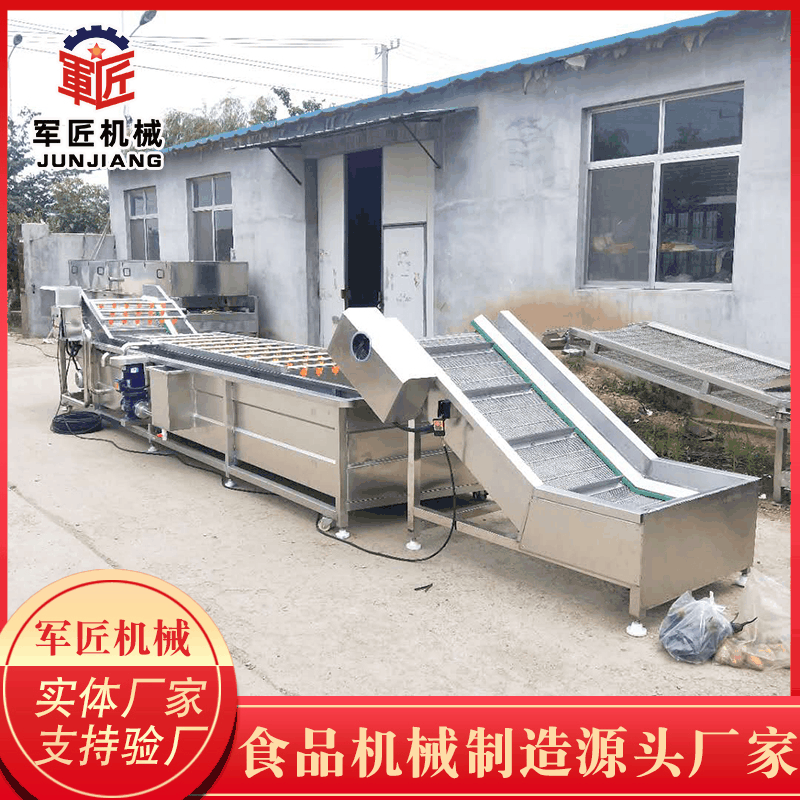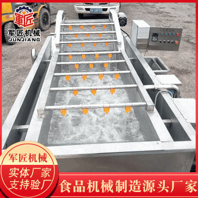 军匠机械生产的果蔬清洗线在气泡、冲浪、提升、喷淋等联合工作下,具有洗洁净高、节能节水、设备稳定可靠等特点。