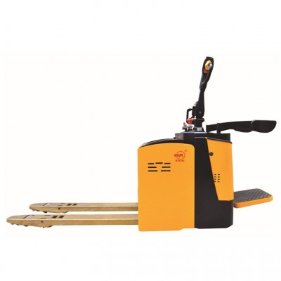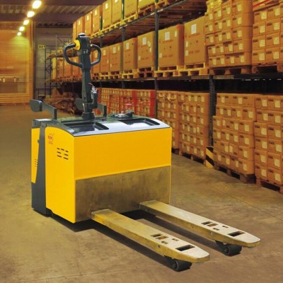 蓄电池防爆托盘搬运车,是采用蓄电池为动力源,以电机为动力,通过齿轮传动驱动车辆行走,货叉的起升靠直流电机和液压传动,推动油缸上下运动起升货叉和货物。由于该车的行走与起升都是采用电动,驾驶方式为站驾式,转向操作为舵把式转向,所以它具有省力、效率高、货物运行平稳、操作简单、安全可靠、噪音小,无污染等特点。该车的电器件均做了防爆处理,因此,该车能够在易燃易爆等危险环境中使用。该车采用24伏大容量电瓶,大大延伸了一次充电后使用的时间。该车适用于在硬质、平坦的地面进行货物搬运作业。