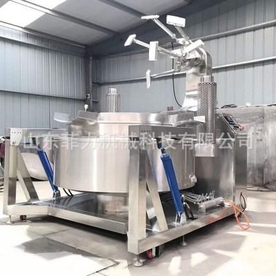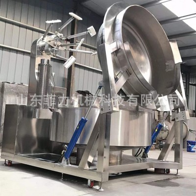 商用快餐店炒菜机器 大型全自动炒菜机 2千人吃饭的大型炒菜锅采用倾斜式传动,使用的行星式搅拌器与锅体充分接触。搅拌系统采用自转公转相结合的方式,其传动比为不整数传动比,保证锅内无任何搅拌盲点。