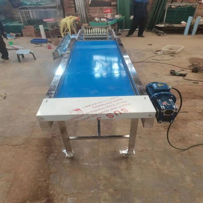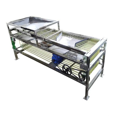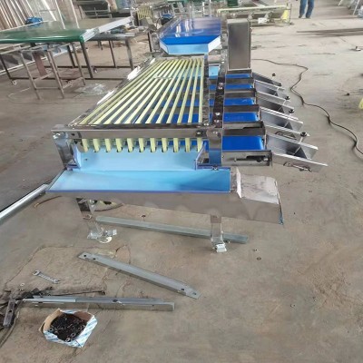 选果机的传送带选用硅橡胶材料制作,韧性好,克服了传送带易裂、易断、易老化的弊端,轨道槽坚固、不易变形;V型槽之间用啮齿轴套相隔,可方便调整传送带的间距,达到了一机多用的效果(圣女果、蒜米、新疆大枣、灰枣、金丝小枣、山楂、沙棘、金桔、沙糖桔、荔枝、龙眼等小型果蔬果实),机身长度增加到三米,可以根据果蔬直径大小将果蔬分成4-7个等级,选果均匀、等级分的细。针对怕伤皮的果品筛选的过程中不容易损伤果皮,筛选效果均匀。