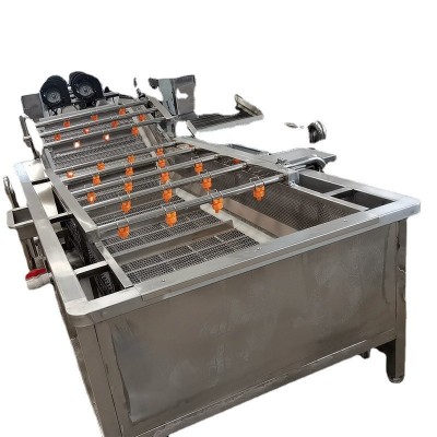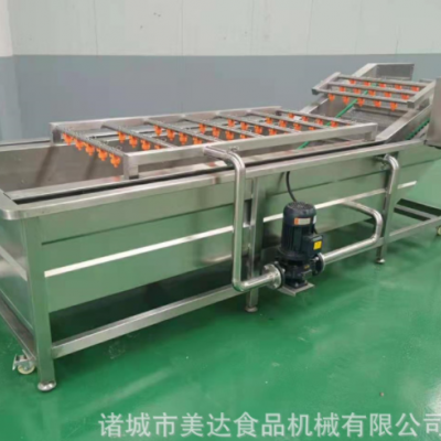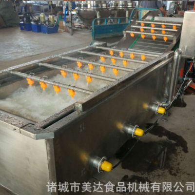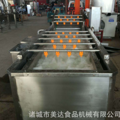 气泡清洗机是大枣,蔬菜,水产生产线中的重要产品,主要用于大枣,蔬菜,水产的清洗。气泡清洗机的原理主要是利用箱体前部分设备箱体中注适量的水,经过加热管将水温加热,原料在经过箱体时,会与气泡机和水的结合作用下做翻滚状态,并随网带不断向前推进,在出水面时,高端设有喷淋头,高压冲洗。 果蔬气泡清洗机特点: