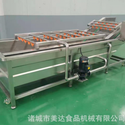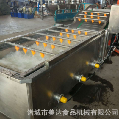 气泡清洗机是大枣,蔬菜,水产生产线中的重要产品,主要用于大枣,蔬菜,水产的清洗。气泡清洗机的原理主要是利用箱体前部分设备箱体中注适量的水,经过加热管将水温加热,原料在经过箱体时,会与气泡机和水的结合作用下做翻滚状态,并随网带不断向前推进,在出水面时,高端设有喷淋头,高压冲洗。 果蔬气泡清洗机特点: