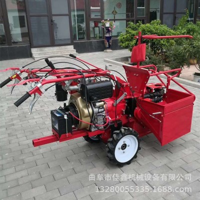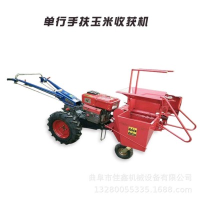 手扶车带玉米收获机是本公司新研发的小型玉米收获机。该机可与12马力以上手扶车配套使用。能一次性完成摘穗、集堆和茎秆粉碎还田等多项作业。一次完成一行的玉米摘穗和秸秆粉碎功能。配套有集穗斗满了可以自动卸载,留茬高低可调,张紧离合器工作安全,转弯半径小好操作。该机每小时收货玉米一到两亩地秸秆直接粉碎,扒皮干净,穗位高度60厘米以上就可以收割,秸秆越高光棒率越大。