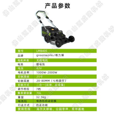 格力博LMB405自走电动草坪车割草机草坪修剪机 82V大功率,质保一年,全铜无刷电机,7挡高度可调,1000W-2000W大功率,带大容量70L集草箱,25寸大范围切割宽度。双电池包自由更换持久续航,轻松工作。轻量材料,无线修整。