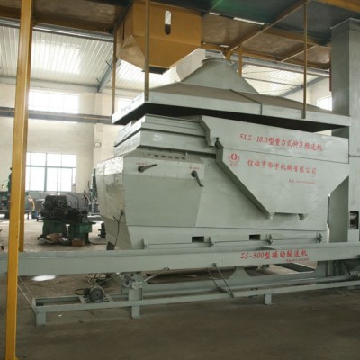 4.1.1采用往复运动的平面筛选结构,按种子的尺寸差异,配置适当规格的筛片,在筛片往复运动下达到分级的目的、圆孔筛按照种子的宽度尺寸进行分级,而长孔筛按种子的厚度尺寸进行分级。 4.1.2该机进料均匀,喂入量由随即提供的控制器来控制,可以通过调节使喂料速度与筛箱振动频率相协调,从而满足不同农作物种子分级要求 4.1.3尺寸:3965*1950*3300(mm) 生产率:12(t) 分级获选率≥98% 功率:振动5.5(kw)喂料0.3(kw) 筛面面积15㎡ 筛层数和片数:5层15片