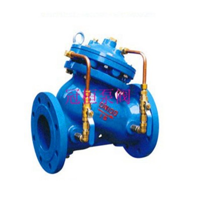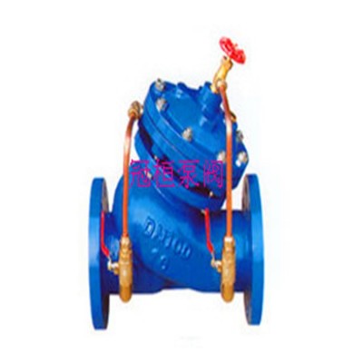 JD745X多功能水泵控制阀由主阀和调节阀及接管系统组成,阀体采用直流式阀体,主阀控制室为膜片式或活塞式的双控制室结构,控制室比一般水力控制阀增加了一个,增加了对主阀的控制功能,实现了对水泵出口的缓慢开启、全开、缓闭、截止等多功能控制,实现了一个阀门、一次调节对水泵出口的多功能控制。
