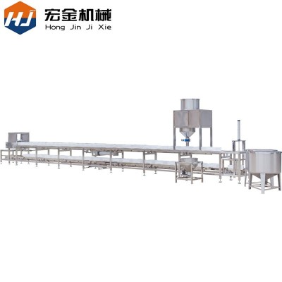宏金机械冲浆豆腐机:豆浆自动上浆、自动定量、自动添加凝固剂、冲浆输送、自动输送翻盒等组成,流水线生产减轻劳动力,提高生产效率,内置调节参数可根据黄豆、水质等调节。