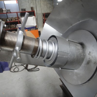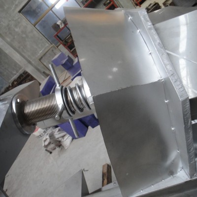 本双螺旋式压榨机工作过程是:输送螺旋将进入料箱的物料推向压榨螺旋,通过压榨螺旋的螺距减小和轴径增大,并在筛壁和锥形体阻力的作用下,使物料所含的液体物(果汁)被挤压出.挤出的液体从筛孔中流出,集中在接汁斗内.压榨后的果渣,经筛筒末端与锥形体之间排出机外,锥形体后部装有弹簧,通过调节弹簧的预紧力和位置,可改变排阻力和出渣口的大小,用来调节压榨的干湿程度. 5、10、20吨/时压榨机为双螺旋转,旋转方向相反,对物料的压榨力大而均匀,出渣口锥形体由液压缸控制,调节油压可改变对物料的施压效果,调整出汁率,本机还可用于其它物料的固液分离,其效果因物料品质不同有一定的差别。本机的进料箱和筛筒及螺旋均采用耐酸碱304不锈钢材料制造。