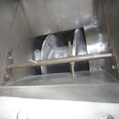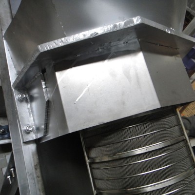 本双螺旋式压榨机工作过程是:输送螺旋将进入料箱的物料推向压榨螺旋,通过压榨螺旋的螺距减小和轴径增大,并在筛壁和锥形体阻力的作用下,使物料所含的液体物(果汁)被挤压出.挤出的液体从筛孔中流出,集中在接汁斗内.压榨后的果渣,经筛筒末端与锥形体之间排出机外,锥形体后部装有弹簧,通过调节弹簧的预紧力和位置,可改变排阻力和出渣口的大小,用来调节压榨的干湿程度. 5、10、20吨/时压榨机为双螺旋转,旋转方向相反,对物料的压榨力大而均匀,出渣口锥形体由液压缸控制,调节油压可改变对物料的施压效果,调整出汁率,本机还可用于其它物料的固液分离,其效果因物料品质不同有一定的差别。本机的进料箱和筛筒及螺旋均采用耐酸碱304不锈钢材料制造。